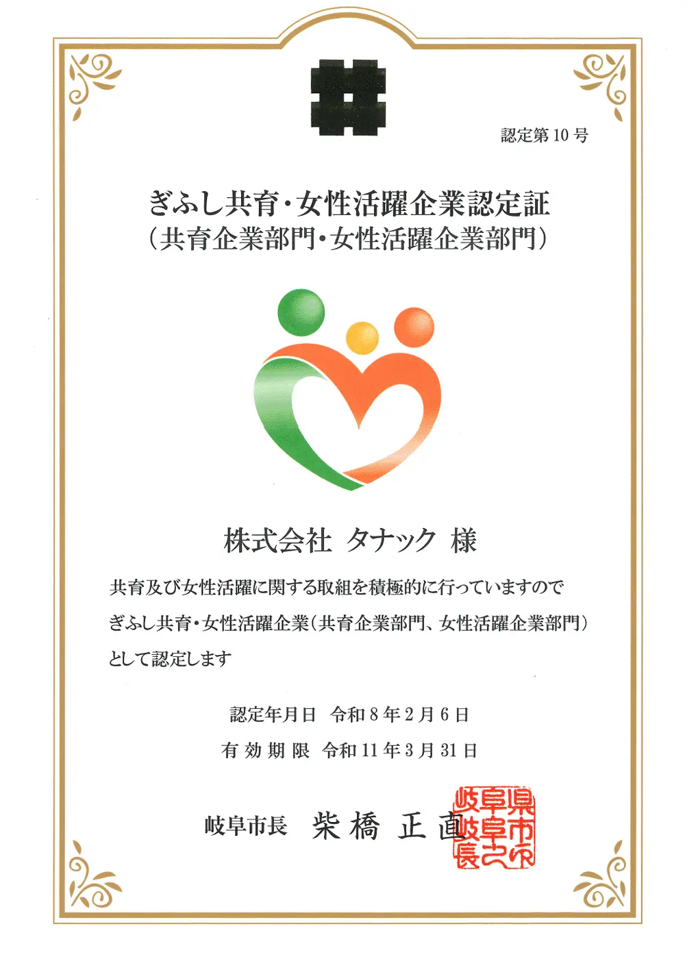 このたび、岐阜市が認定する「ぎふし共育・女性活躍企業」の更新を受け、タナックは共育企業部門と女性活躍企業部門の認定を受けました。