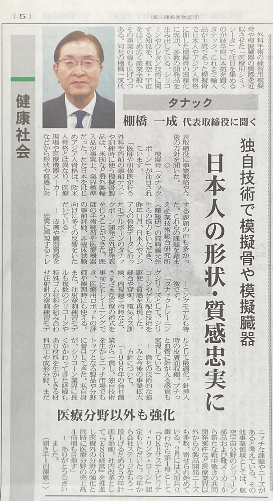化学工業日報(2023/2/28発刊)健康社会の欄に、弊社代表取締役の事業戦略・今度の方針コメントを掲載頂きました。昨年発表いたしました疑似骨・模擬骨(タナックボーン)や、医療トレーニングモデルのタナックトレーニングについて取り上げて頂いております。